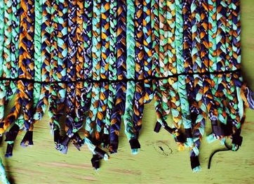 Now, if you are making a rounded rug, one way to connect the stripes is to make a hole on each side and bind them together as shown below. Make three yarns this way and start braiding them. You will need to sew them or glue them together.